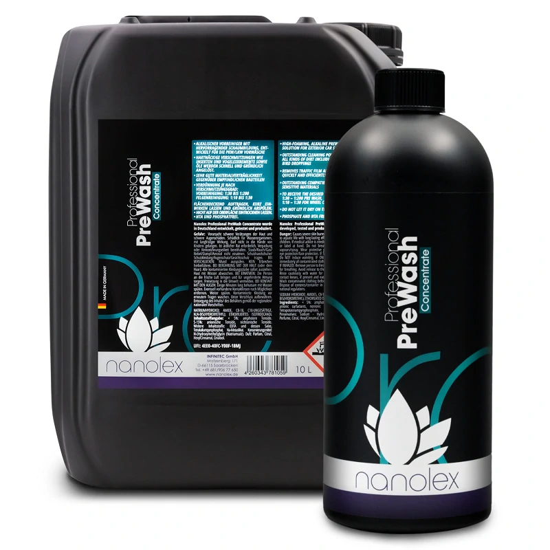 Nanolex Professional PreWash Concentrate je alkalický předčistič bez fosfátů a NTA se silnými pěnivými vlastnostmi. Složení pro předpírku je založeno na vysoce kvalitních komplexotvorných látkách a speciálních povrchově aktivních látkách, které velmi rychle a důkladně rozpouštějí i odolné přilnavosti, jako je hmyz, ptačí exkrementy a také nečistoty z okolního prostředí a ráfků. Díky svým speciálním inhibitorům koroze má velmi dobrou materiálovou snášenlivost s citlivými součástmi.